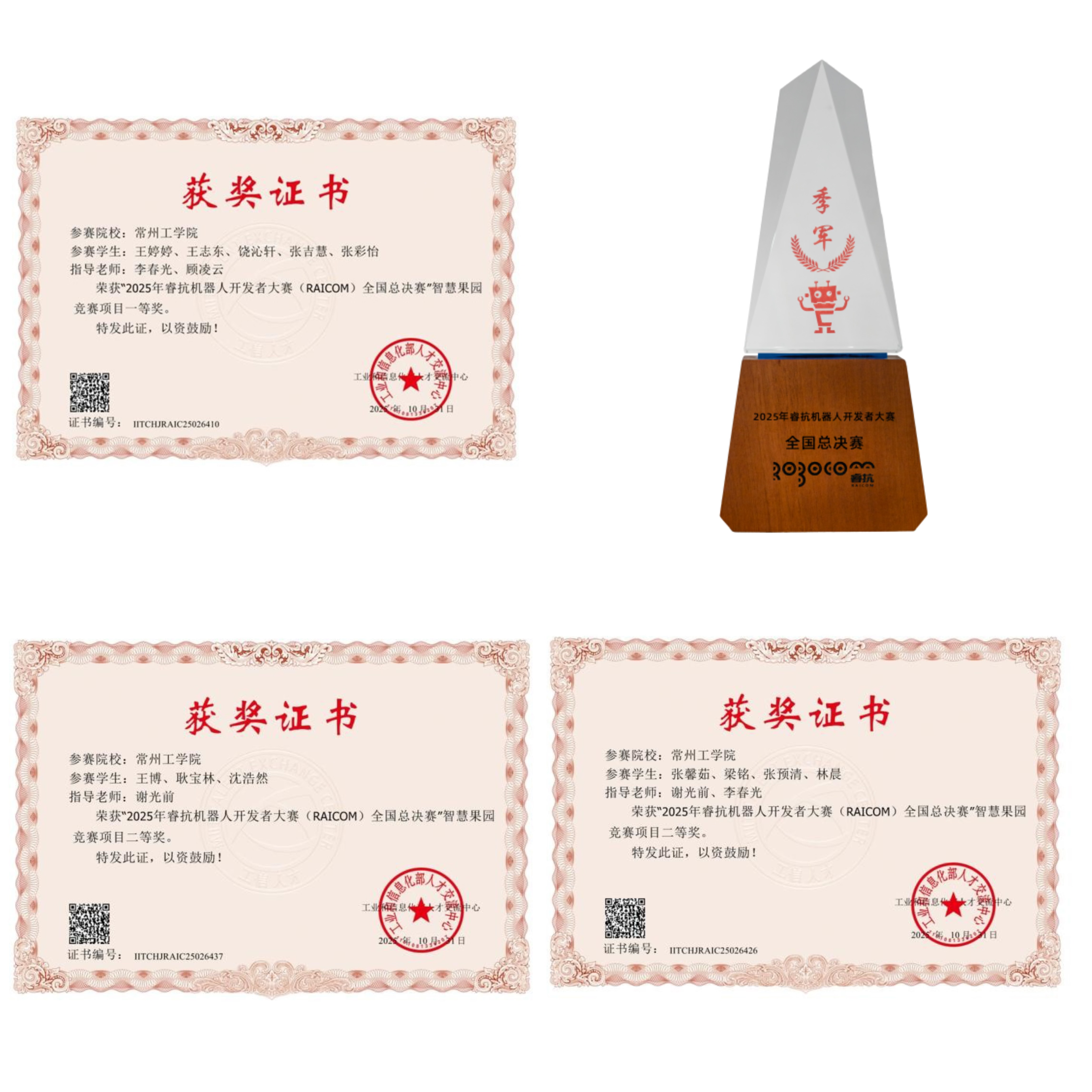 近日,由工业和信息化部人才交流中心主办的“2025睿抗机器人开发者大赛(RAICOM)全国总决赛”智慧果园竞赛项目圆满落幕。经过激烈角逐,计算机信息工程学院李春光、谢光前、顾凌云等老师指导的团队表现优异,共荣获国家级季军一等奖1项,二等奖2项!