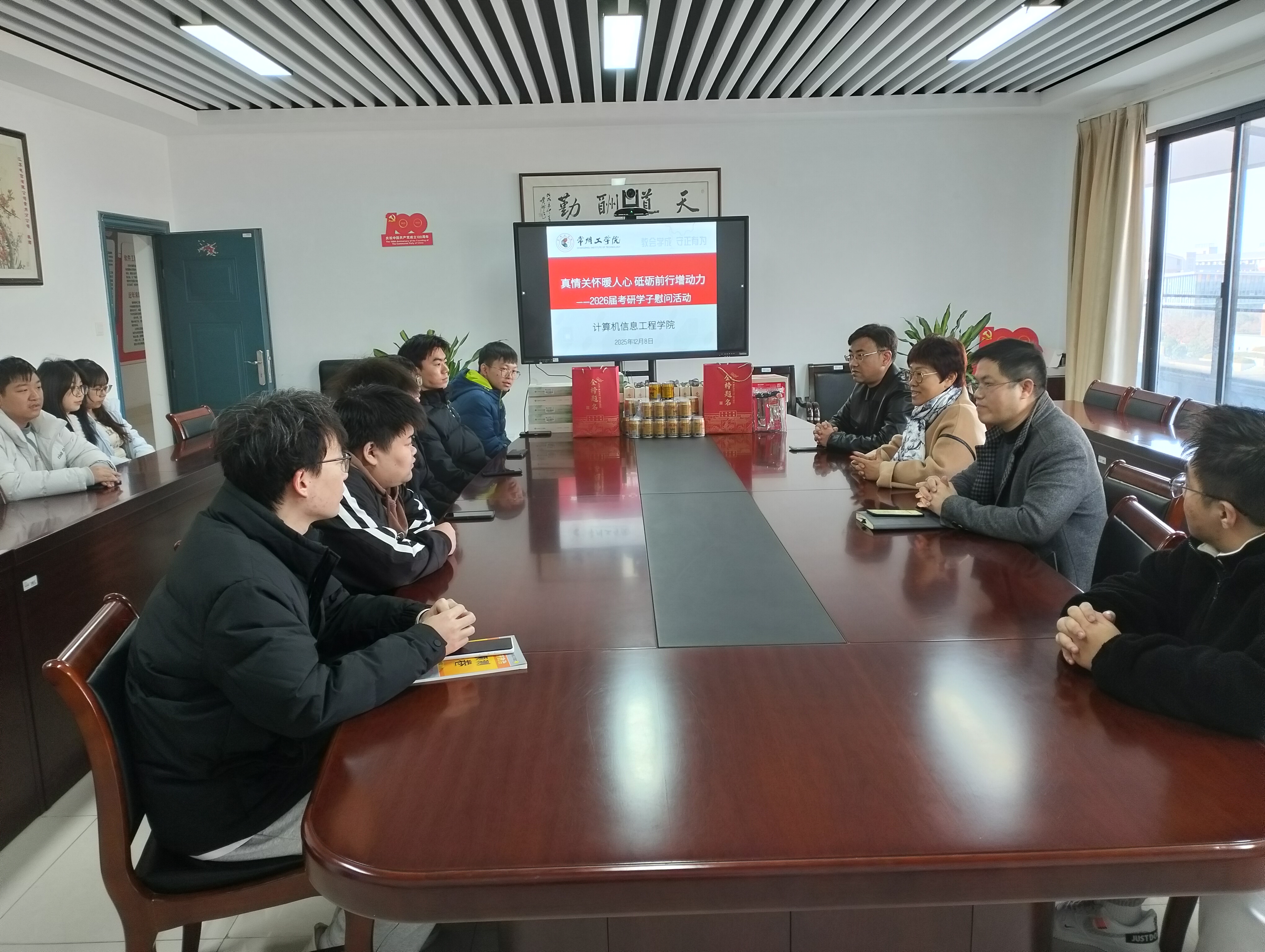 为鼓舞考研学子士气,缓解备考压力,传递学院温暖与支持,12月8日,计算机信息工程学院精心组织了一场暖心慰问活动。学院党政领导代表全院师生,亲切看望并慰问了正在紧张备战2026年全国硕士研究生招生考试的学子们,为他们送上精心准备的慰问品与诚挚的祝福。