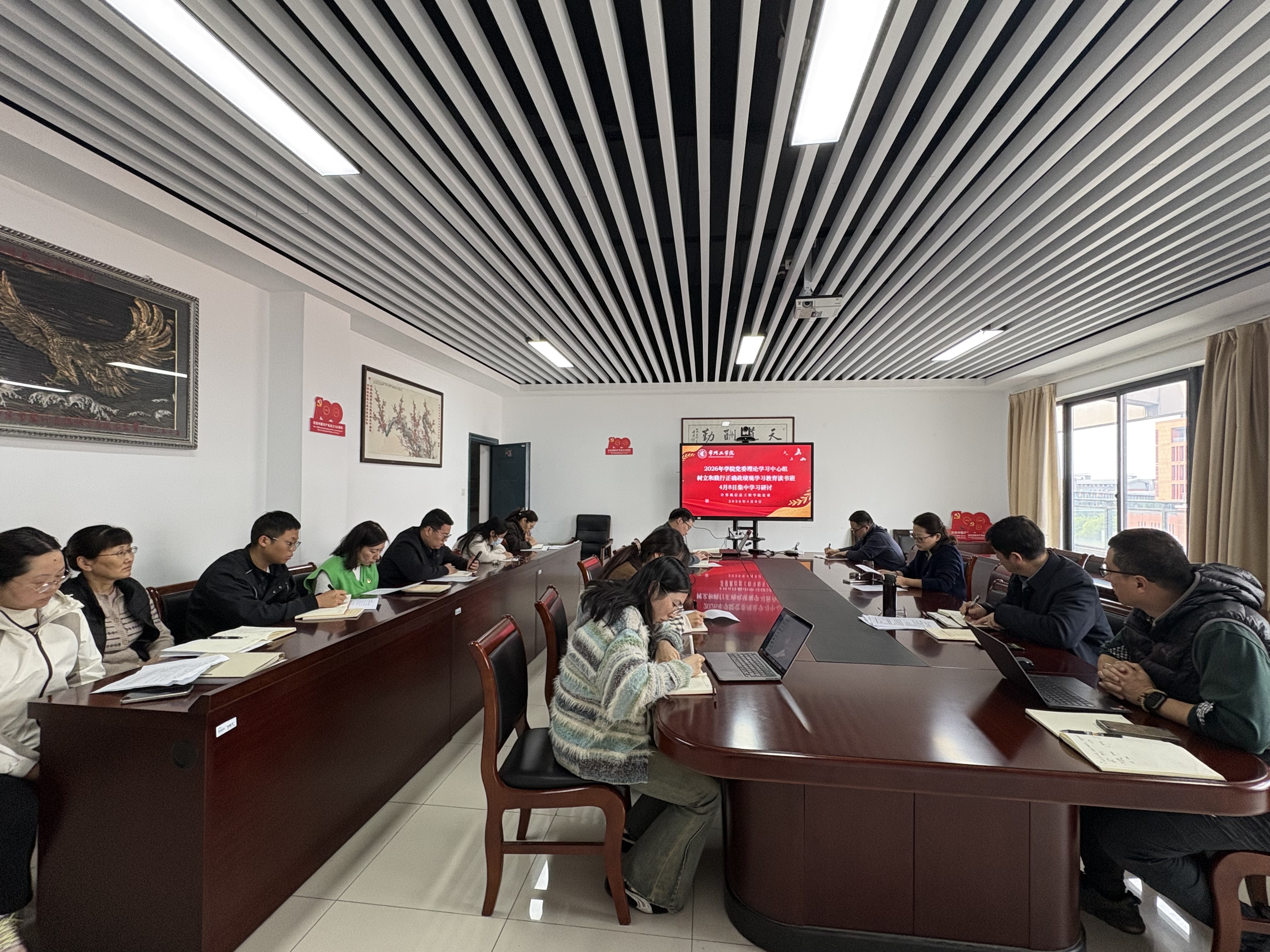 2026年4月8日下午,计算机信息工程学院党委理论学习中心组在开阳楼A508举行树立和践行正确政绩观学习教育读书班集中学习研讨。学院党委书记朱建群主持会议并作领学发言,中心组(扩大)成员参加学习。